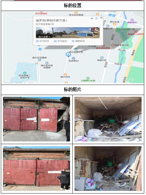 標的位于修文縣人民南路工行洗腳塘宿舍,建筑面積為30㎡,共兩個獨立車庫。該標的東至人民南路,南至小區(qū)道路,西至小區(qū)道路,北至小區(qū)道路;建筑結(jié)構(gòu)為磚混結(jié)構(gòu),層高約3米,無物業(yè)管理,戶型結(jié)構(gòu)為開間。