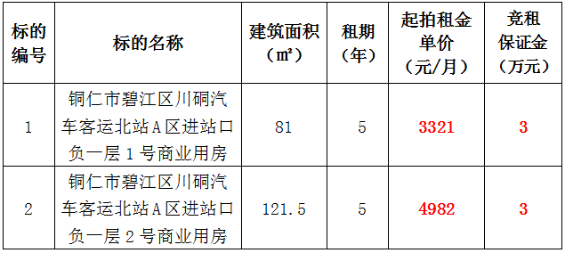 1、銅仁市碧江區(qū)川硐汽車客運北站A區(qū)進站口負一層1號門面,面積:81㎡,租賃期:5年,起拍租金:3321元/月,競租保證金:3萬元;