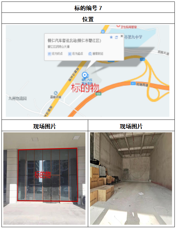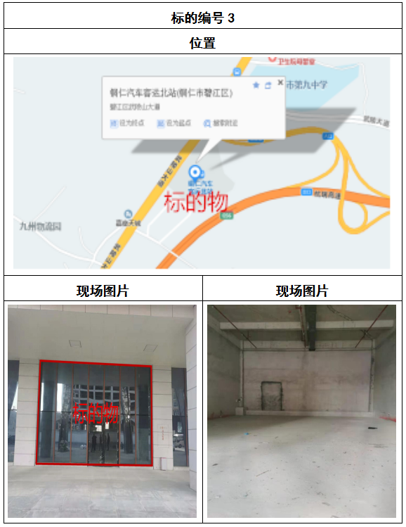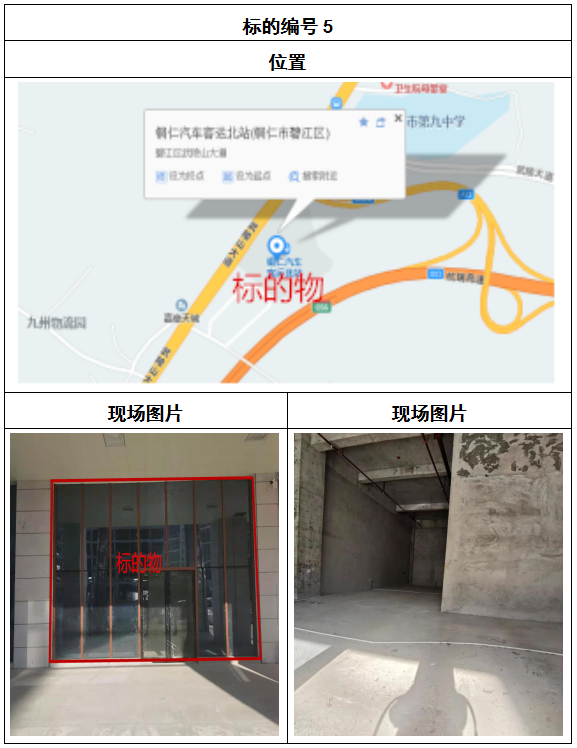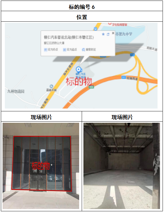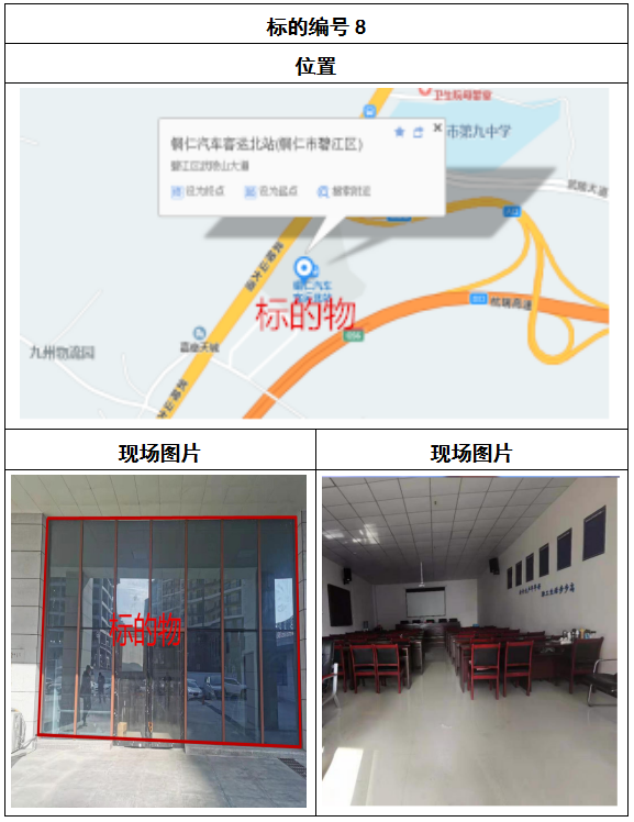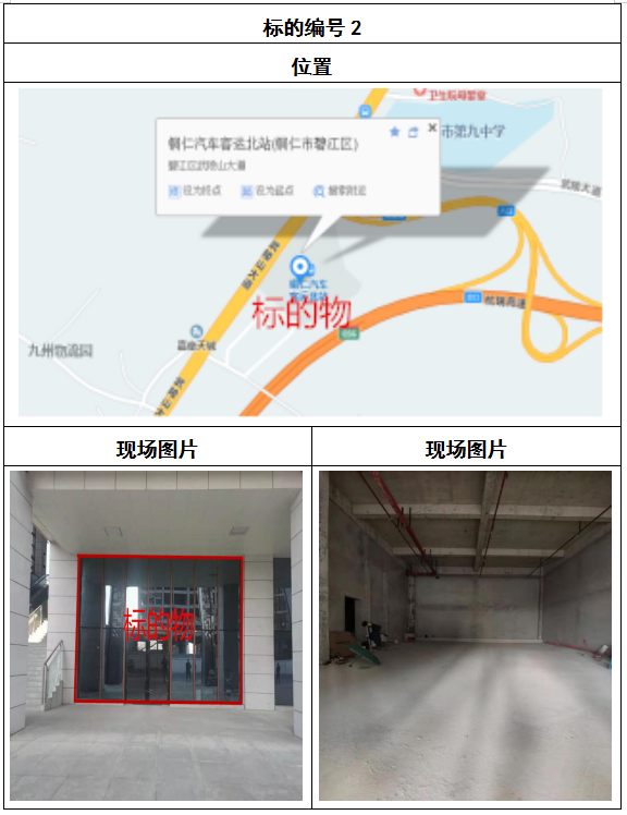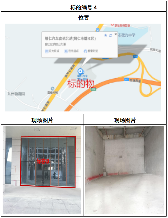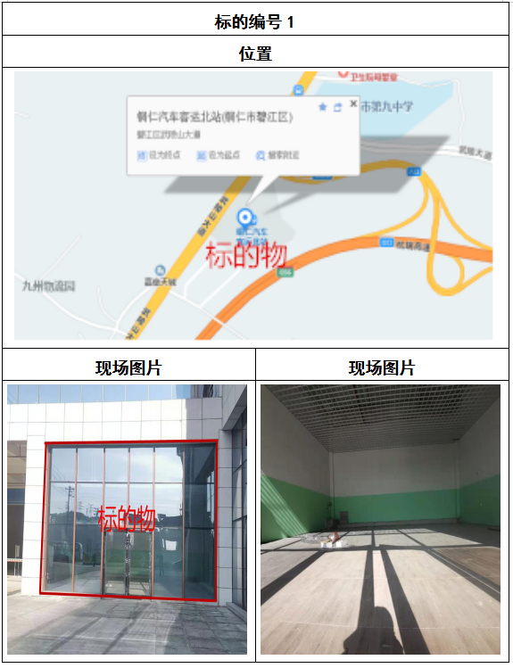 拍品8號和9號標的位于銅仁碧江區(qū)川硐汽車客運北站A區(qū)進站口負一層8-9號的商業(yè)房地產,位于銅仁市中心以北,銅仁汽車北站安置旁,建筑面積分別為:121.5㎡、121.5㎡,租賃期5年,該標的位置交通便利,人流量大。