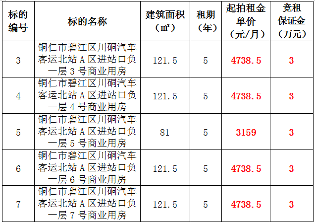 3、銅仁市碧江區(qū)川硐汽車客運北站A區(qū)進站口負一層3號門面,面積:121.5㎡,租賃期:5年,起拍租金:4738.5元/月,競租保證金:3萬元;