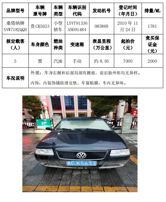 拍品編號1:桑塔納牌SVW7182QQD小型轎車一輛