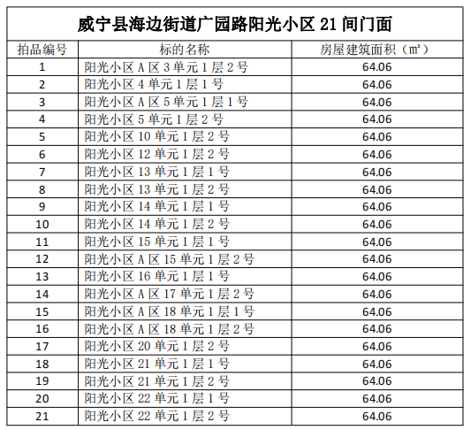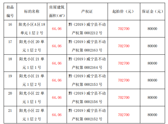 拍品編號16-21號標的位于威寧縣海邊街道廣園路陽光小區(qū),房屋結(jié)構(gòu)均為:混合結(jié)構(gòu),權(quán)利性質(zhì):國有土地/出讓/其他,用途:商服用地/商業(yè)服務,使用期限:2012年12月20號至2052年12月19日。