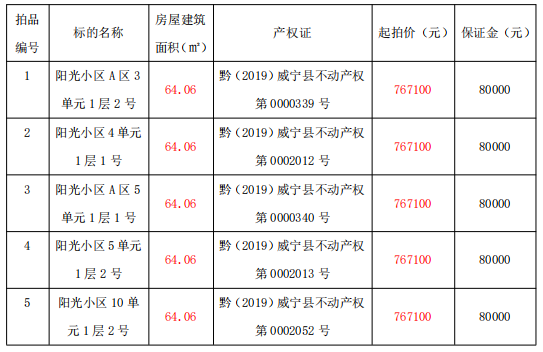 拍品編號1-5號標的位于威寧縣海邊街道廣園路陽光小區(qū),房屋結(jié)構(gòu)均為:混合結(jié)構(gòu),權(quán)利性質(zhì):國有土地/出讓/其他,用途:商服用地/商業(yè)服務,使用期限:2012年12月20號至2052年12月19日。