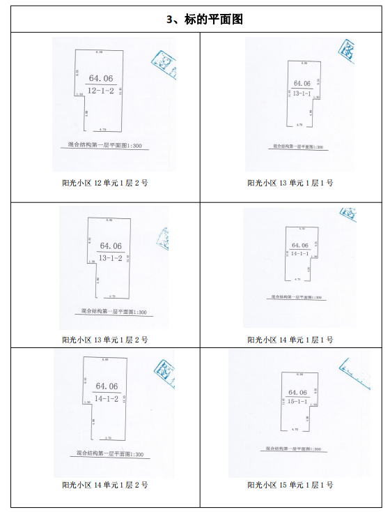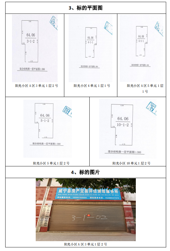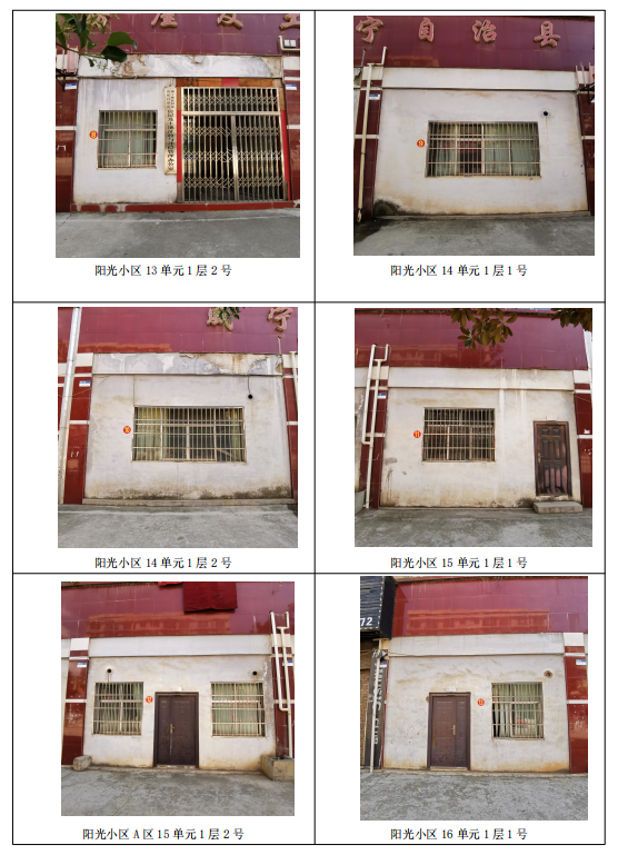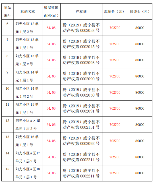 拍品編號6-15號標的位于威寧縣海邊街道廣園路陽光小區(qū),房屋結(jié)構(gòu)均為:混合結(jié)構(gòu),權(quán)利性質(zhì):國有土地/出讓/其他,用途:商服用地/商業(yè)服務,使用期限:2012年12月20號至2052年12月19日。