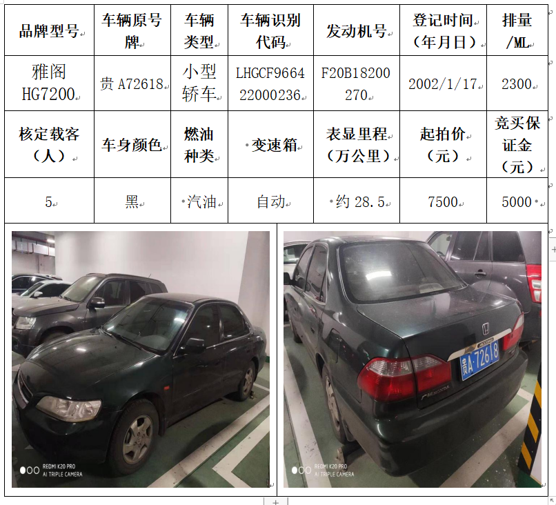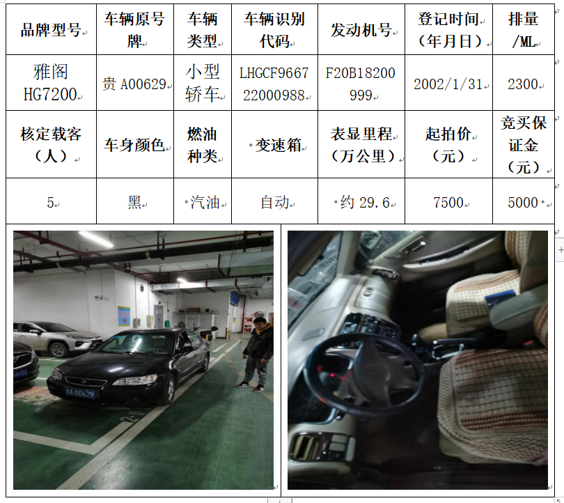 拍品編號(hào)2:雅閣HG7200小型轎車一輛