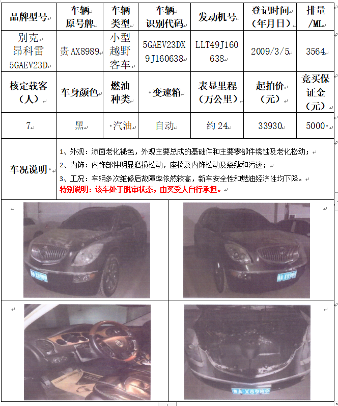 拍品編號(hào)9:別克昂科雷5GAEV23D小型越野客車一輛
