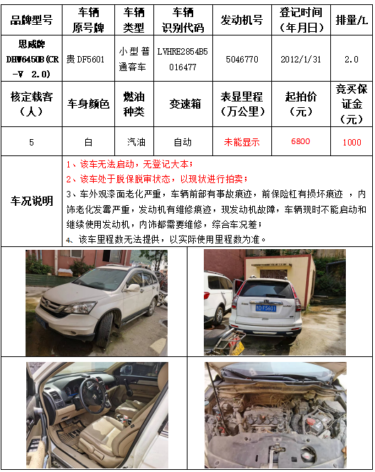拍品編號(hào)15:思威牌DHW6450B(CR-V 2.0)小型普通客車一輛