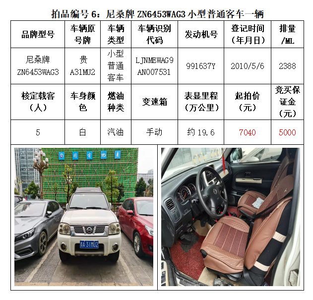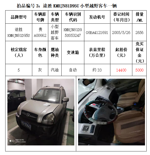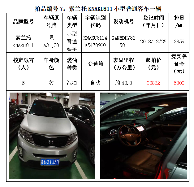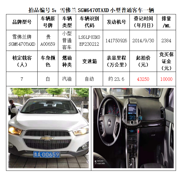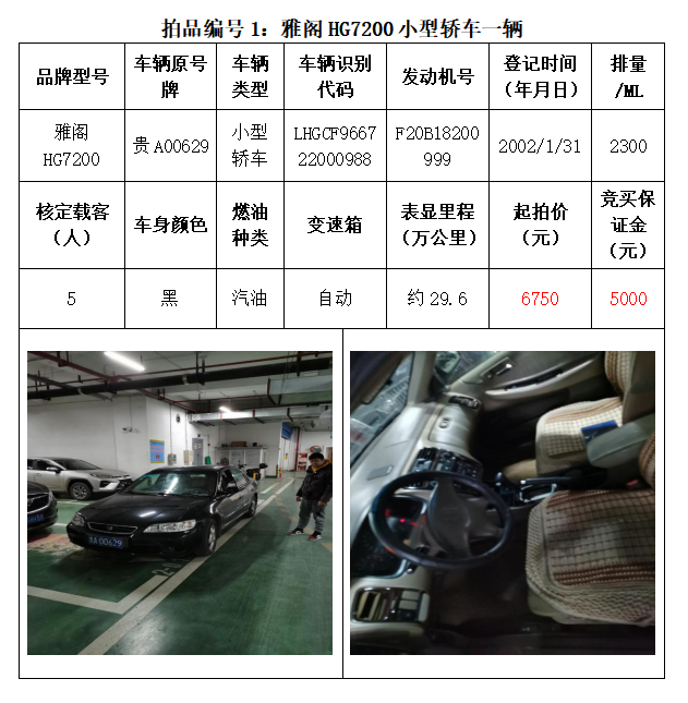 一、拍賣標的:雅閣HG7200小型轎車1輛、別克牌SGM6527AT小型普通客車1輛、途勝KMHJN81D95U小型越野客車1輛、長城牌CC6460KM29小型越野客車1輛、雪佛蘭SGM6470TAXD小型普通客車1輛、尼桑牌ZN6453WAG3小型普通客車1輛,索蘭托KNAKU811小型普通客車1輛,共計7輛車。