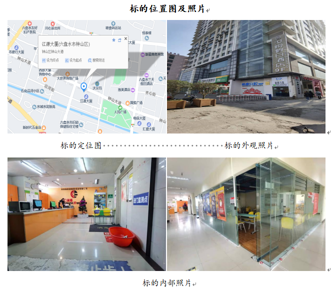 標(biāo)的位于六盤水市鐘山區(qū)鐘山中路江源大廈46號6層601室的商業(yè)房地產(chǎn),建筑面積為1181.04㎡,樓幢總層數(shù)為27層,所在樓憧為鋼筋混凝土結(jié)構(gòu),建成于2010年。