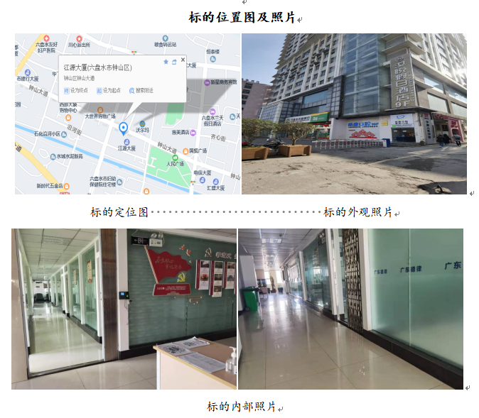 標(biāo)的位于六盤水市鐘山區(qū)鐘山中路江源大廈46號5層501室的商業(yè)房地產(chǎn),建筑面積為1232.86㎡,樓幢總層數(shù)為27層,所在樓憧為鋼筋混凝土結(jié)構(gòu),建成于2010年。