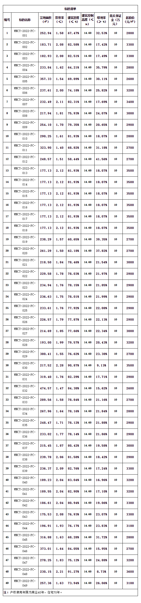 標(biāo)的位于畢節(jié)市威寧彝族回族苗族自治縣陽光大道加油站旁,地處威寧縣政府東北方向,距威寧縣政府約1.6公里;該批土地共計(jì)49塊,用地面積175.53㎡-474.57㎡,總面積11881.48㎡,所有宗地均為商住用地,使用年限:商業(yè):40年,住宅:70年。
