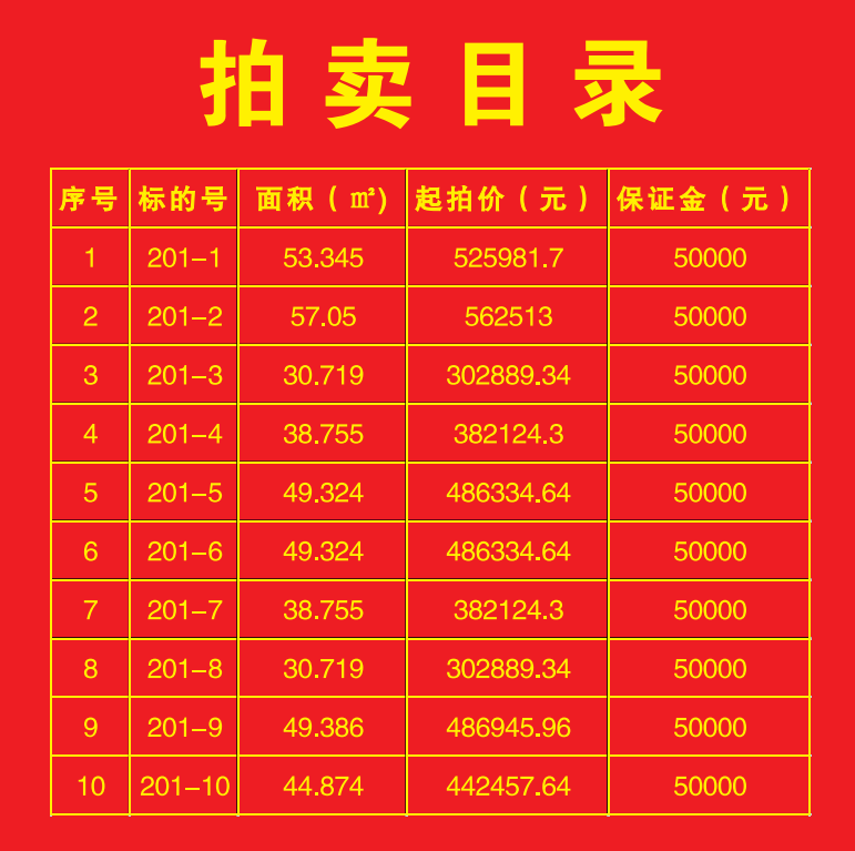 1、安順市西秀區(qū)建軍路4號(hào)順大廣源公寓2幢2-6單元2層201-1號(hào)至201-10號(hào)共計(jì)10個(gè)商業(yè)用房,位于地面1層(對(duì)面為安順市第二幼兒園),建筑面積30㎡—57㎡不等,起拍價(jià):30.28萬(wàn)元—52.59萬(wàn)元不等,保證金:每個(gè)標(biāo)的5萬(wàn)元整(標(biāo)的物詳情以拍賣資料為準(zhǔn))。