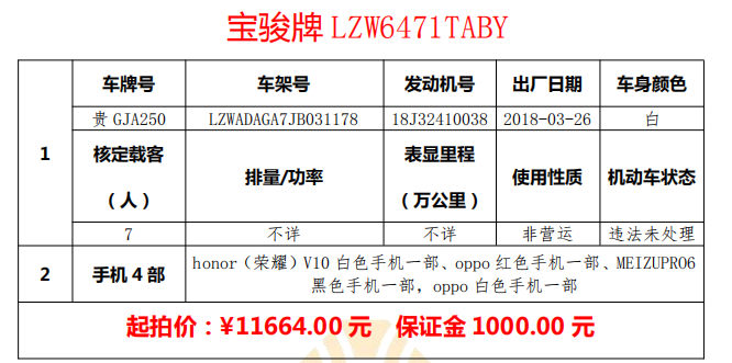 標(biāo)的一:貴GJA250寶駿牌730小型汽車一輛、honor(榮耀)V10白色手機(jī)一部、oppo紅色手機(jī)一部、MEIZUPRO6黑色手機(jī)一部,oppo白色手機(jī)一部。起拍價:11664.00元,保證金:1000.00元。