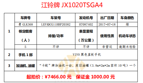 標(biāo)的二:貴GLK368 江鈴牌輕型貨車一輛、“卡蟻”牌加油機(jī)一臺、廢舊油罐(3.8m×2m×2m容積10噸)一個,VIVO黑色直板手機(jī)一部。起拍價:7466.00元,保證金:1000.00元。